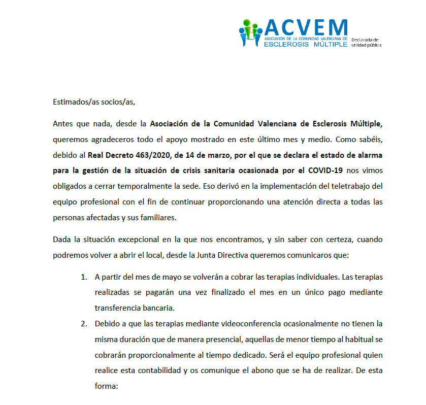 Comunicado ACVEM Pincha el siguiente enlace para acceder al comunicado emitido por la asociación sobre las terapias individuales. Comunicado ACVEM