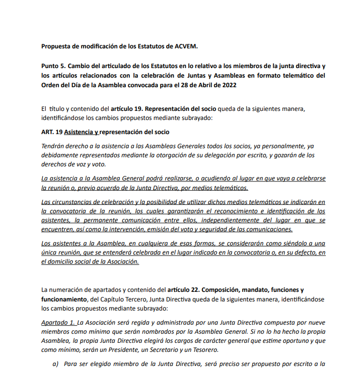 Propuesta de modificación de los Estatutos de ACVEM PUNTO 5 ASAMBLEA.PROPUESTA CAMBIO ESTATUTOS