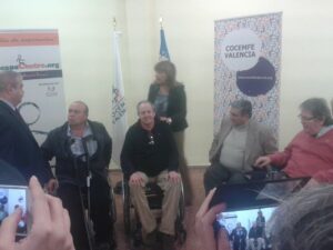 En el centro de la foto, Antonio Llácer, a su derecha Carlos Laguna (presidente de COCEMFE CV y vicepresidente del CERMI CV) y a su izquierda Albert Marín (presidente de COCEMFE Valencia).